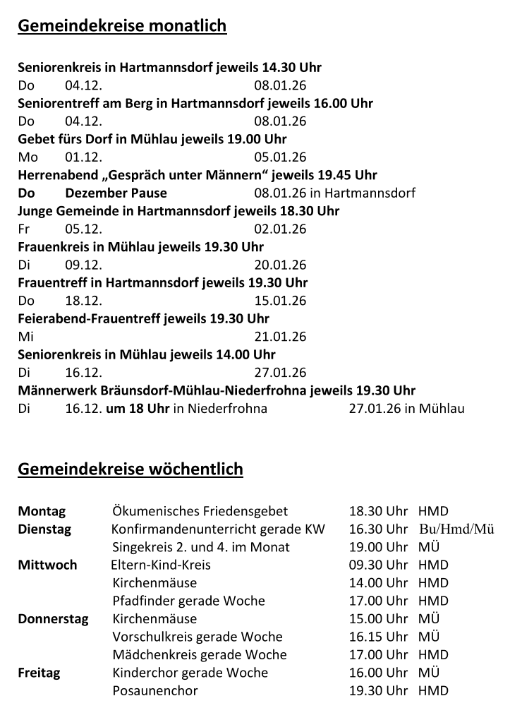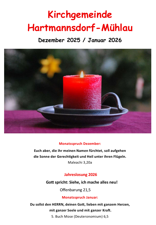 wer den Gemeindebrief der Kirchgemeinde Hartmannsdorf-Mühlau aller zwei Monate zugestellt haben möchte, kann seinen Bedarf in den beiden Pfarrbüros anmelden bzw. eine E-Mail an kg.hartmannsdorf-muehlau@evlks.de schreiben. Das ist eher zum weitersagen, denn hier ist der Gemeidebrief immer verfügbar und aktuell.